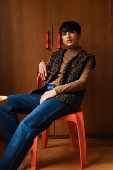 Alain : une veste sans manches au style affirmé, confectionnée dans le tissu du manteau David, pièce iconique d’une précédente collection. Un clin d’œil durable, une seconde vie.