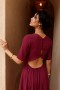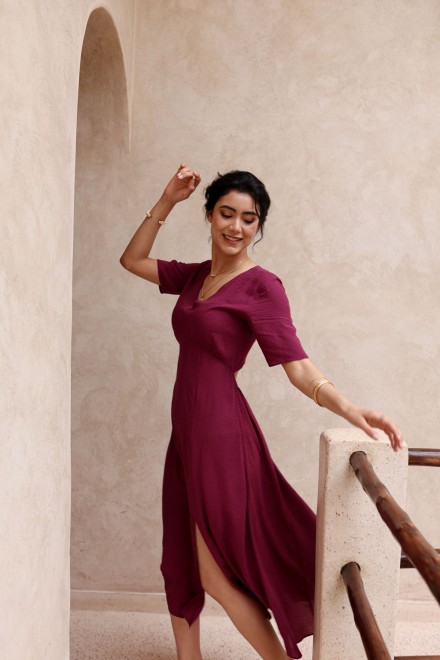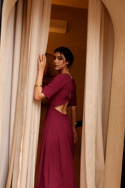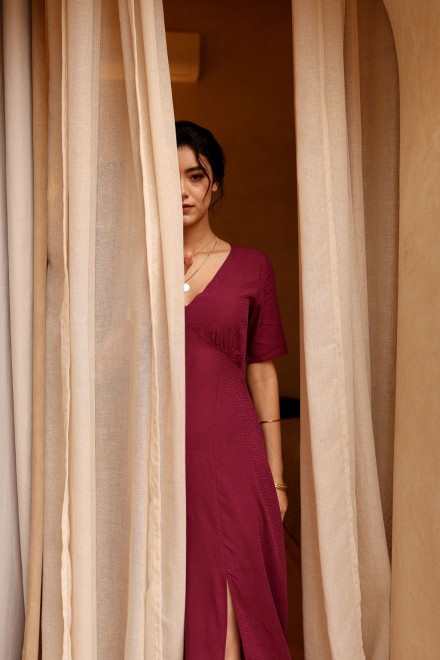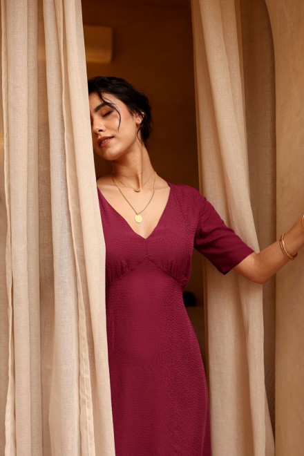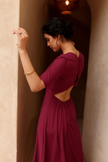 Confectionnée dans un tissu délicatement texturé qui capte la lumière, la robe Esmée révèle toute la profondeur de sa teinte mûre.