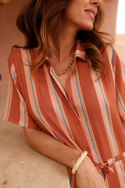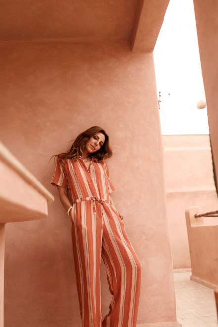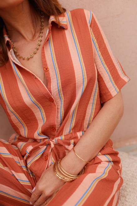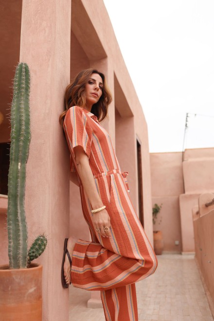 Son tissu léger, sublimé par de fines rayures apporte de la lumière et une touche estivale à la combinaison.