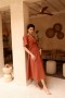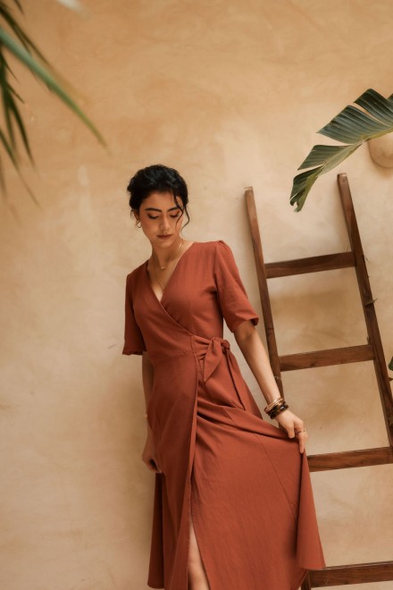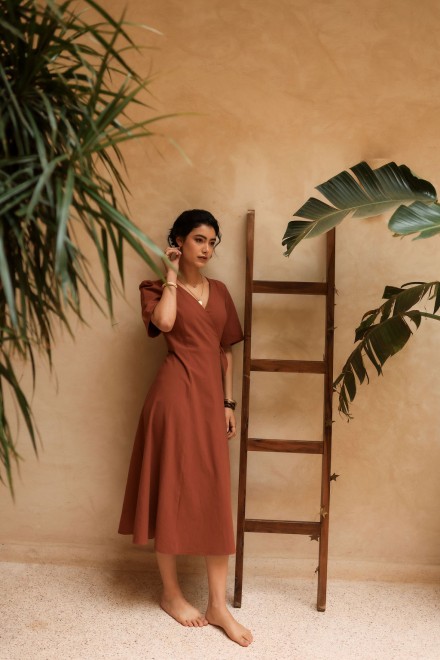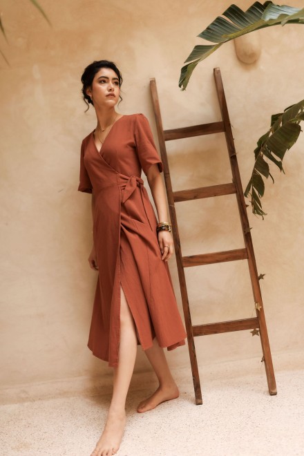 Son décolleté croisé et sa taille délicatement marquée soulignent la silhouette avec naturel. Sa jupe fluide accompagne le mouvement avec légèreté tandis que son lien nouer à la taille permet d'ajuster la coupe avec élégance. Les manches apportent douceur et équilibre à la silhouette.